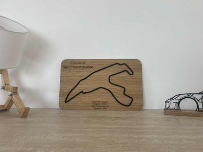 Panneau en chêne comportant les informations principales du circuit de Spa Francorchamps ainsi que son tracé.