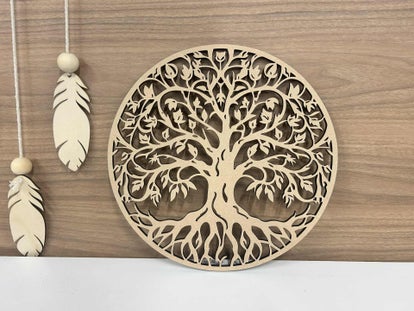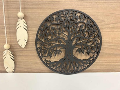 Décoration a poser "Fleurs" en MDF naturel et posée sur un socle en placage chêne.