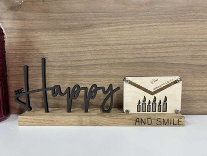 Ensemble cadeau d'anniversaire composé d'une décoration "Be happy and smile" et d'une carte cadeau en bois dans laquelle déposer quelques sous, le tout sur un socle en chêne massif.